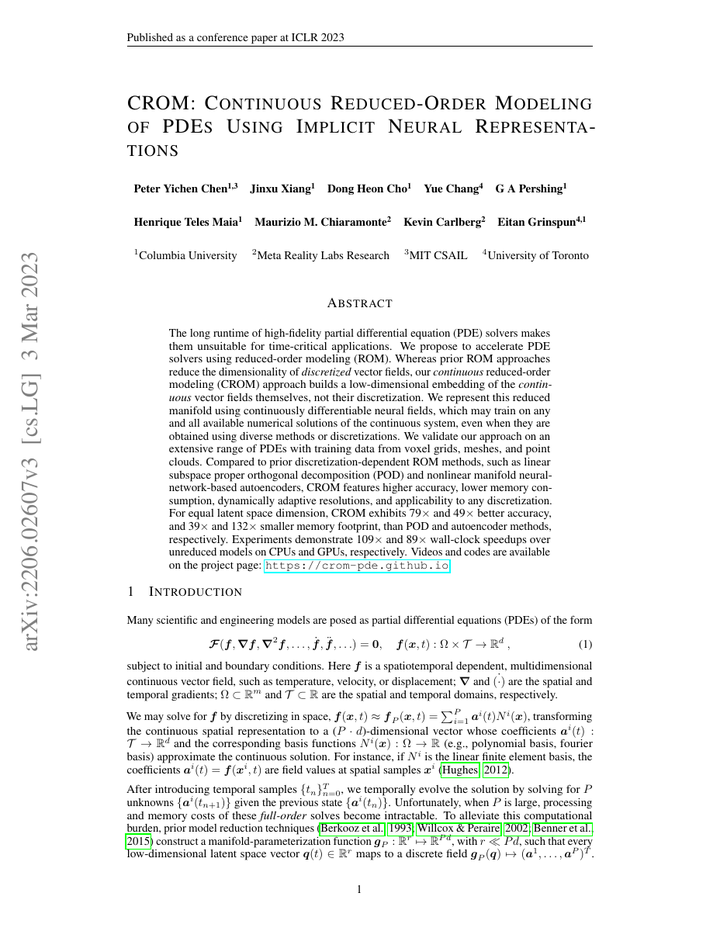 CROM: Continuous reduced-order modeling with implicit neural representationsWe propose CROM (Continuous Reduced-Order Modeling), a framework for model reduction of PDEs using implicit neural representations. By leveraging coordinate-based neural networks, CROM represents the solution manifold continuously in both space and time, enabling super-resolution queries and analytical computation of spatiotemporal derivatives. This approach combines the approximation power of neural networks with the mathematical rigor of projection-based model reduction, offering significant advantages for scientific computing and real-time simulation applications.